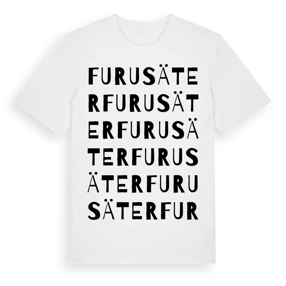 Furusäter ordlek t-shirt är inspirerad av byn Furusäter i Västra Götalands län, Sverige. Tröjan är designad för dig som har en speciell koppling till platsen – oavsett om du bor här, har rötterna här eller bara älskar Furusäter.