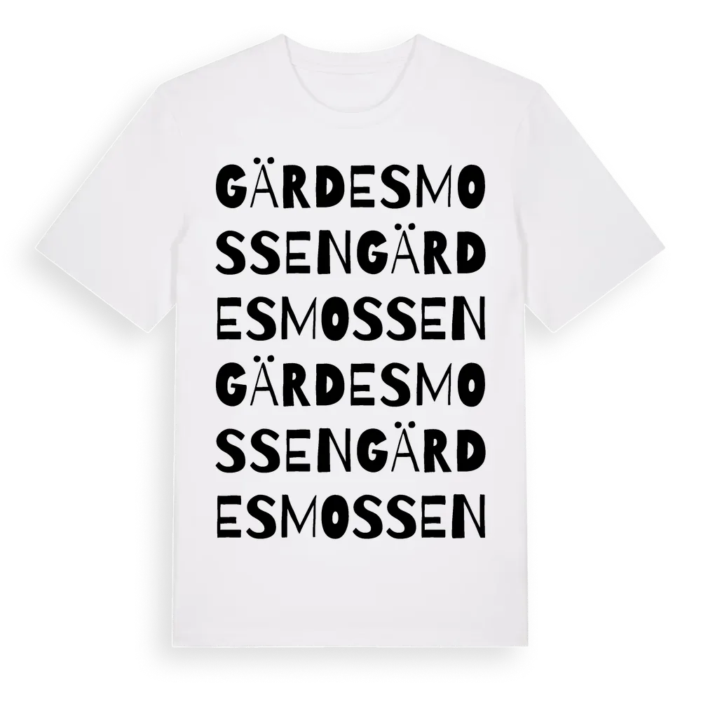 Gärdesmossen ordlek t-shirt är inspirerad av Gärdesmossen i Västra Götalands län, Sverige. Tröjan är designad för dig som har en speciell koppling till platsen – oavsett om du bor här, har rötterna här eller bara älskar Gärdesmossen.