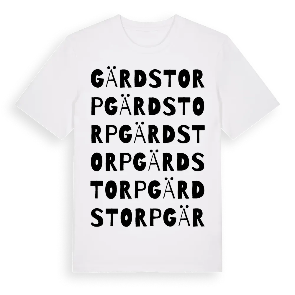 Gärdstorp ordlek t-shirt är inspirerad av Gärdstorp i Västra Götalands län, Sverige. Tröjan är designad för dig som har en speciell koppling till platsen – oavsett om du bor här, har rötterna här eller bara älskar Gärdstorp.