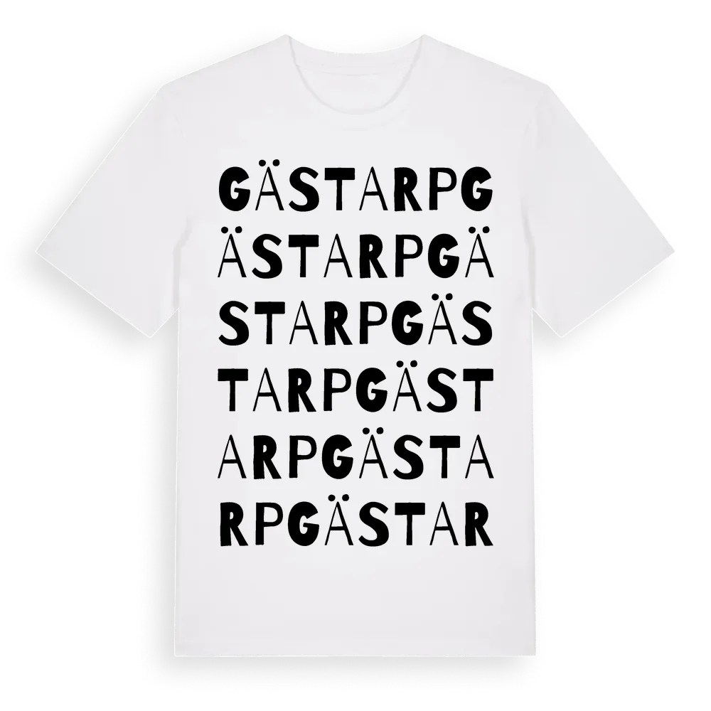 Gästarp ordlek t-shirt är inspirerad av byn Gästarp i Västra Götalands län, Sverige. Tröjan är designad för dig som har en speciell koppling till platsen – oavsett om du bor här, har rötterna här eller bara älskar Gästarp.
