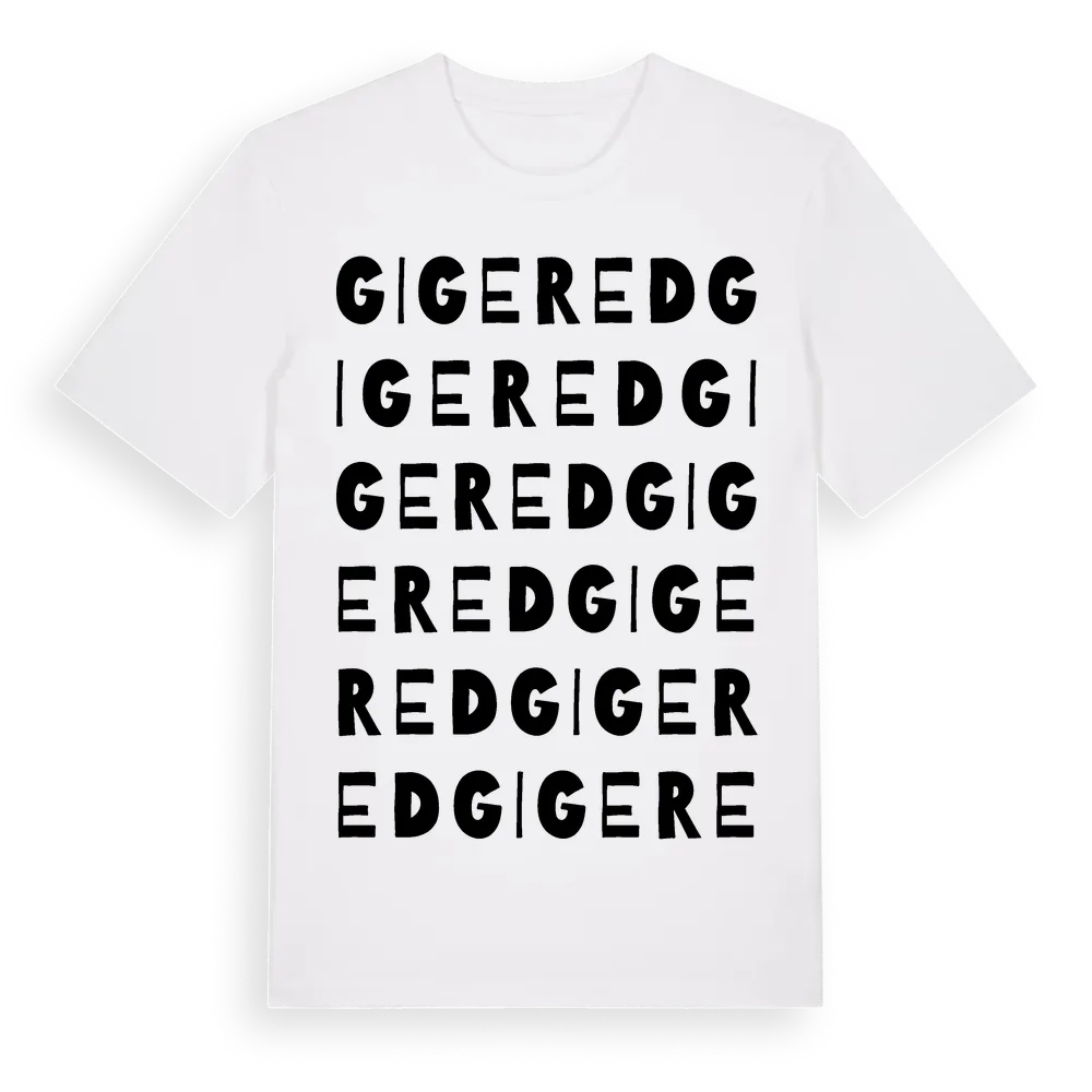 Gigered ordlek t-shirt är inspirerad av byn Gigered i Västra Götalands län, Sverige. Tröjan är designad för dig som har en speciell koppling till platsen – oavsett om du bor här, har rötterna här eller bara älskar Gigered.