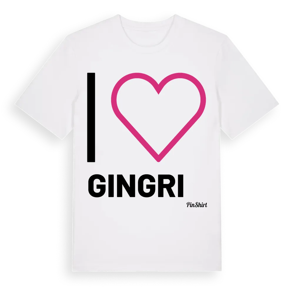 Jag älskar Gingri t-shirt stort tryck är inspirerad av byn Gingri i Västra Götalands län, Sverige. Tröjan är designad för dig som har en speciell koppling till platsen – oavsett om du bor här, har rötterna här eller bara älskar Gingri.