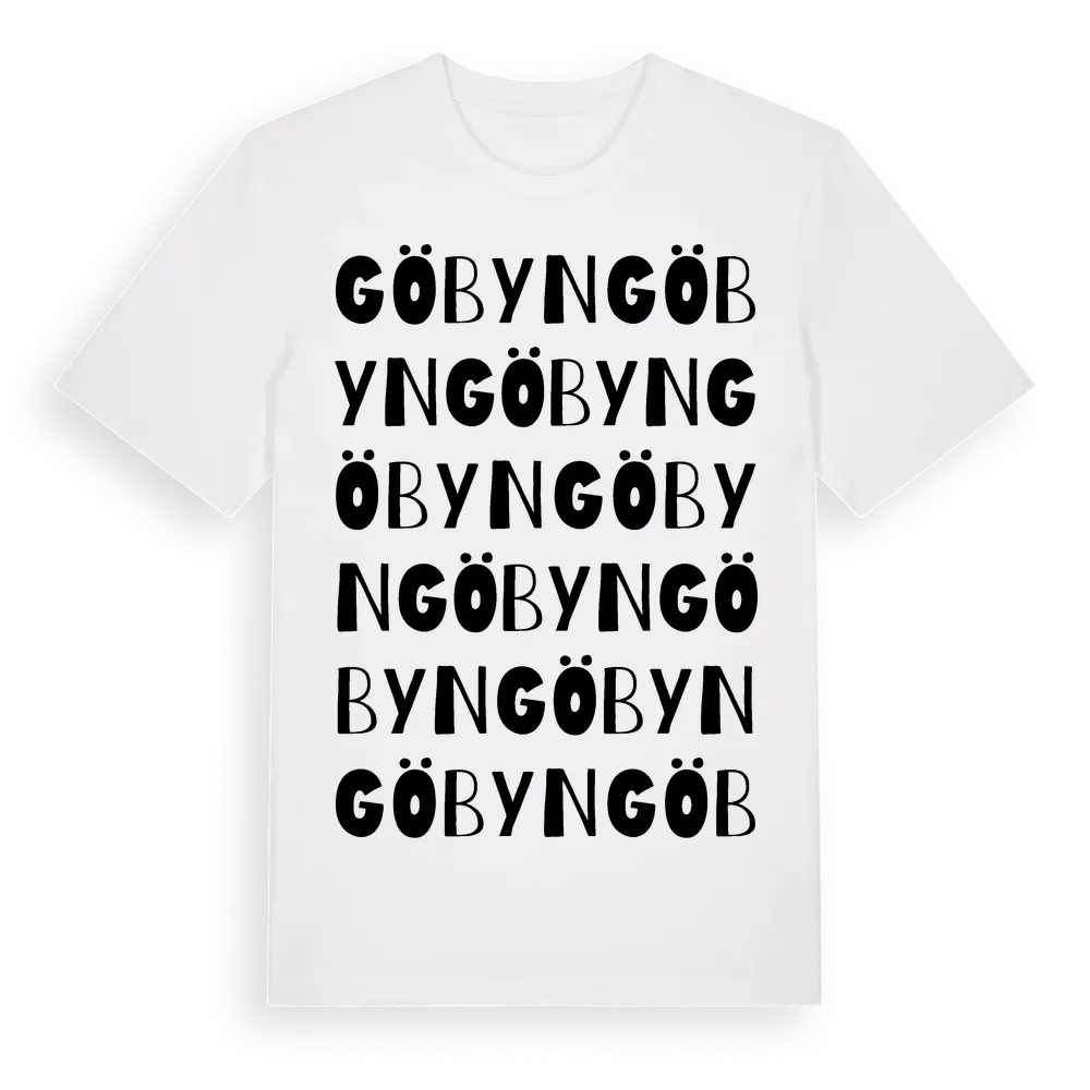 Göbyn ordlek t-shirt är inspirerad av byn Göbyn i Västra Götalands län, Sverige. Tröjan är designad för dig som har en speciell koppling till platsen – oavsett om du bor här, har rötterna här eller bara älskar Göbyn.