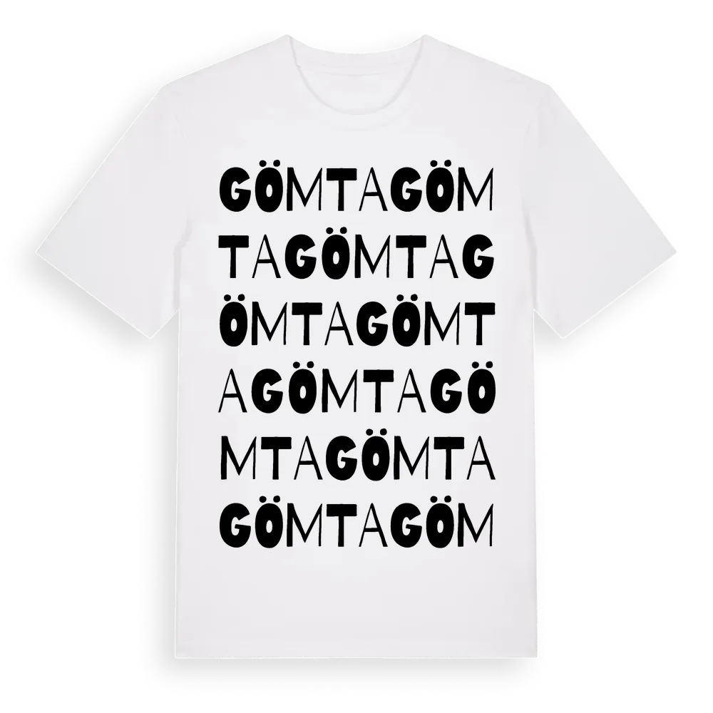 Gömta ordlek t-shirt är inspirerad av Gömta i Västra Götalands län, Sverige. Tröjan är designad för dig som har en speciell koppling till platsen – oavsett om du bor här, har rötterna här eller bara älskar Gömta.