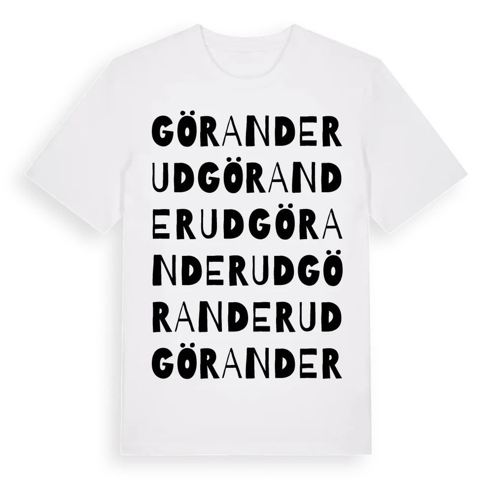 Göranderud ordlek t-shirt är inspirerad av Göranderud i Västra Götalands län, Sverige. Tröjan är designad för dig som har en speciell koppling till platsen – oavsett om du bor här, har rötterna här eller bara älskar Göranderud.