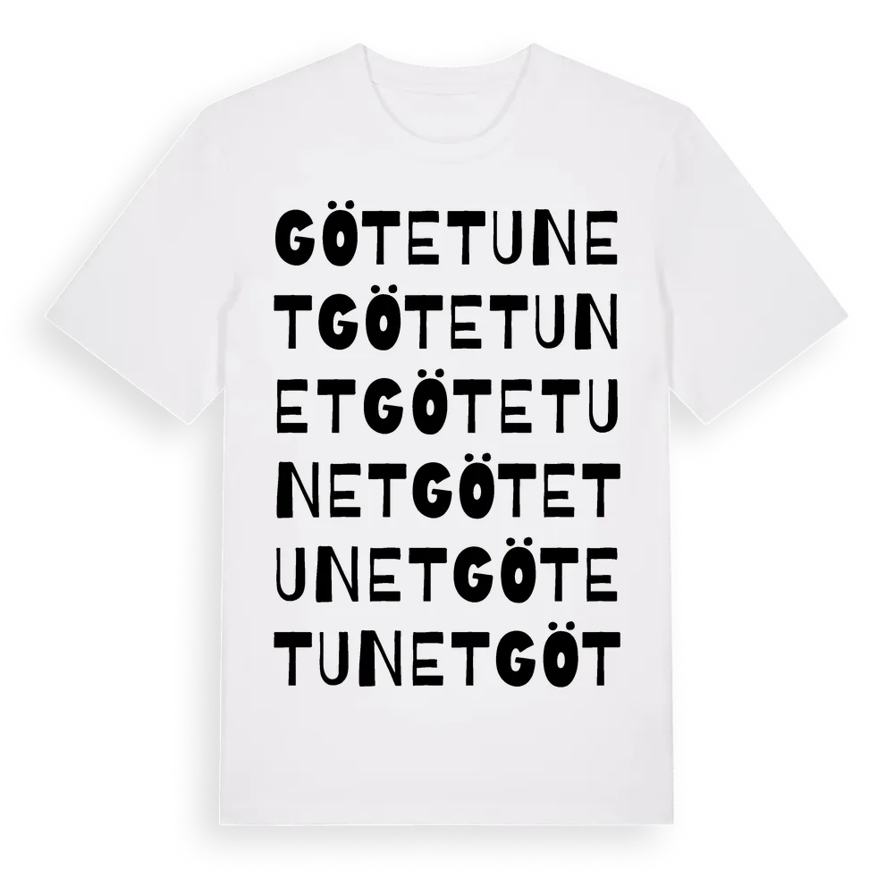 Götetunet ordlek t-shirt är inspirerad av Götetunet i Västra Götalands län, Sverige. Tröjan är designad för dig som har en speciell koppling till platsen – oavsett om du bor här, har rötterna här eller bara älskar Götetunet.