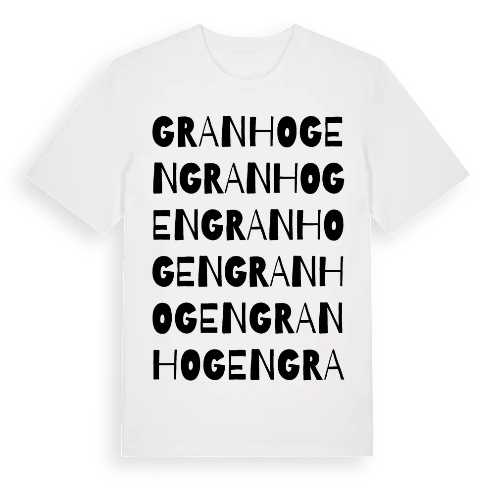 Granhogen ordlek t-shirt är inspirerad av Granhogen i Västra Götalands län, Sverige. Tröjan är designad för dig som har en speciell koppling till platsen – oavsett om du bor här, har rötterna här eller bara älskar Granhogen.