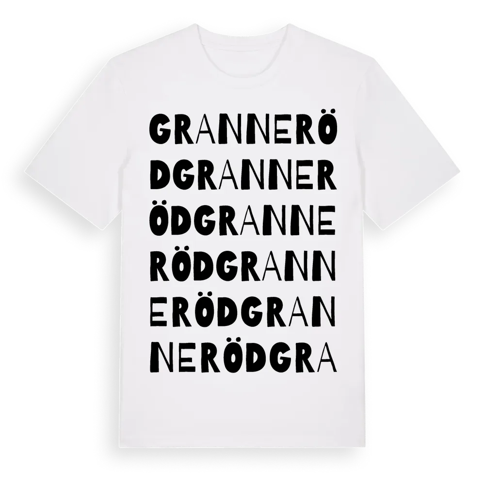 Granneröd ordlek t-shirt är inspirerad av byn Granneröd i Västra Götalands län, Sverige. Tröjan är designad för dig som har en speciell koppling till platsen – oavsett om du bor här, har rötterna här eller bara älskar Granneröd.