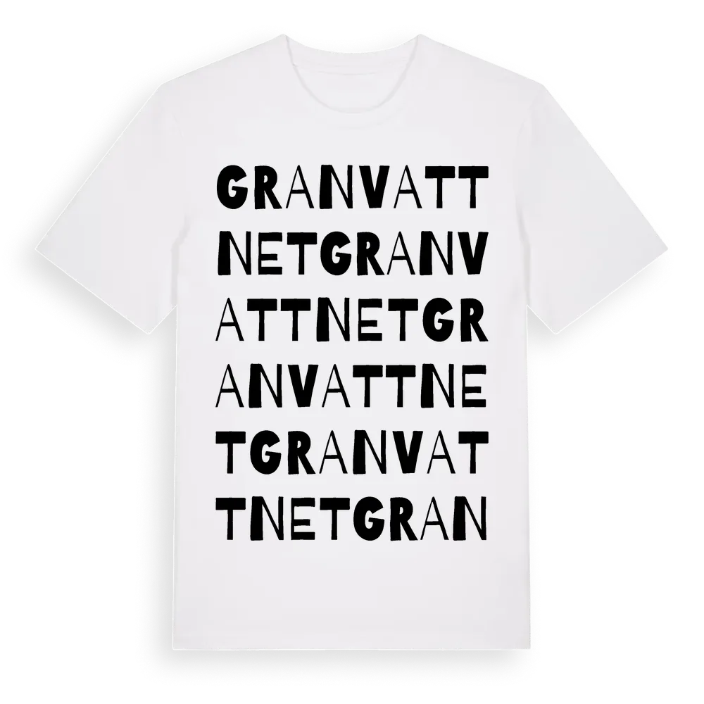 Granvattnet ordlek t-shirt är inspirerad av Granvattnet i Västra Götalands län, Sverige. Tröjan är designad för dig som har en speciell koppling till platsen – oavsett om du bor här, har rötterna här eller bara älskar Granvattnet.