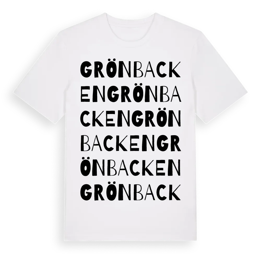 Grönbacken ordlek t-shirt är inspirerad av Grönbacken i Västra Götalands län, Sverige. Tröjan är designad för dig som har en speciell koppling till platsen – oavsett om du bor här, har rötterna här eller bara älskar Grönbacken.