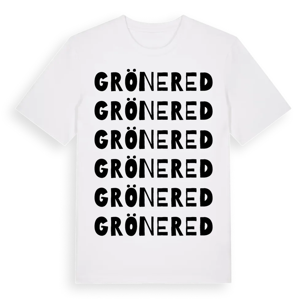 Grönered ordlek t-shirt är inspirerad av byn Grönered i Västra Götalands län, Sverige. Tröjan är designad för dig som har en speciell koppling till platsen – oavsett om du bor här, har rötterna här eller bara älskar Grönered.