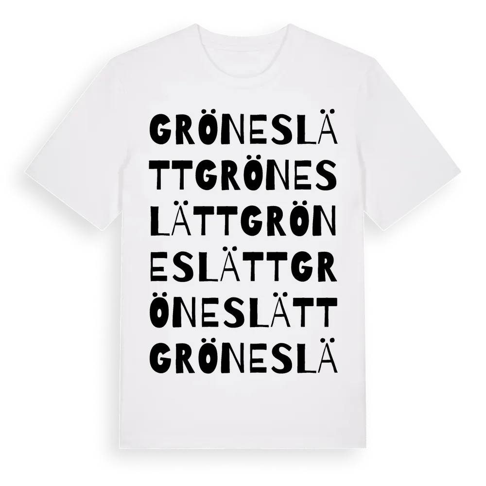 Gröneslätt ordlek t-shirt är inspirerad av Gröneslätt i Västra Götalands län, Sverige. Tröjan är designad för dig som har en speciell koppling till platsen – oavsett om du bor här, har rötterna här eller bara älskar Gröneslätt.