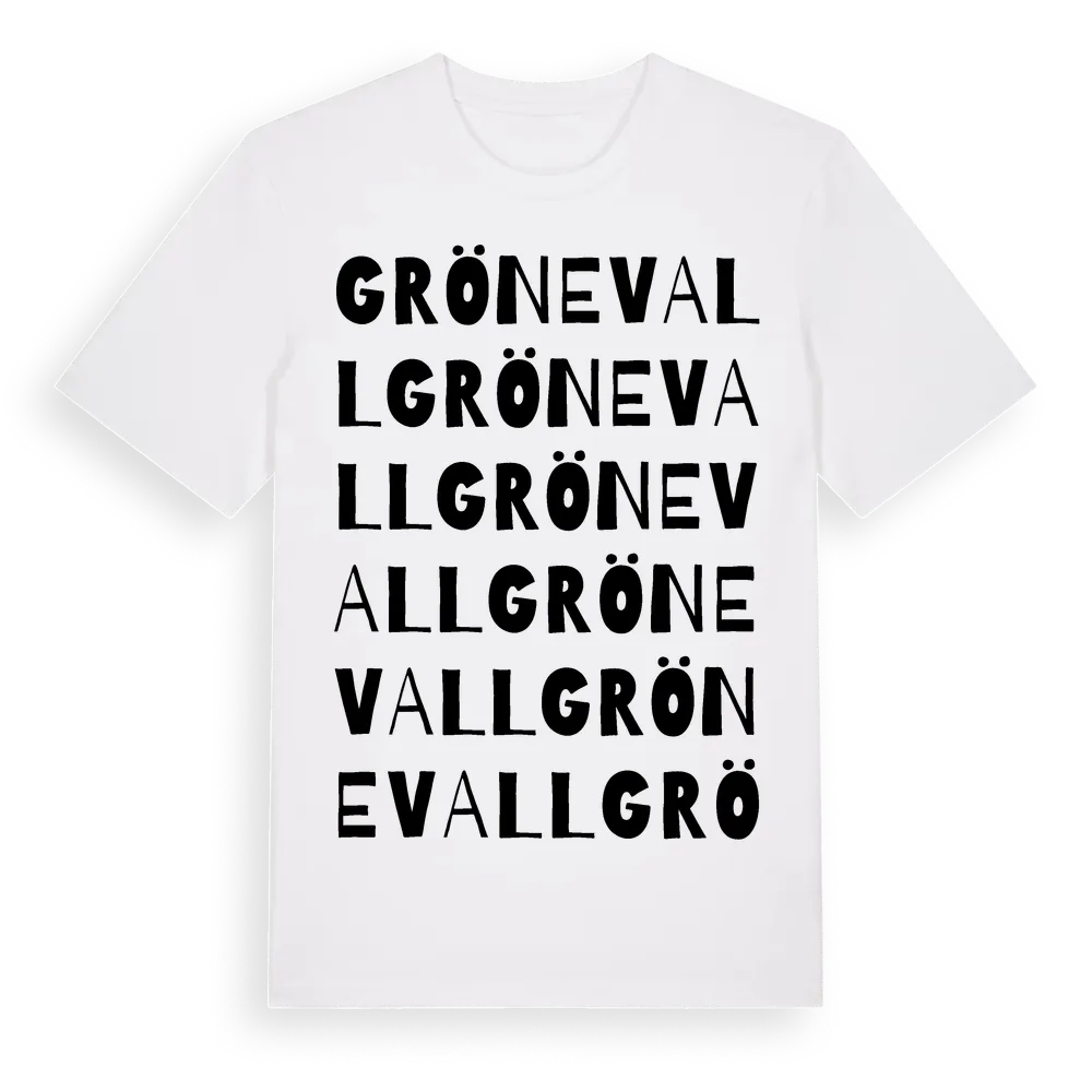 Grönevall ordlek t-shirt är inspirerad av Grönevall i Västra Götalands län, Sverige. Tröjan är designad för dig som har en speciell koppling till platsen – oavsett om du bor här, har rötterna här eller bara älskar Grönevall.
