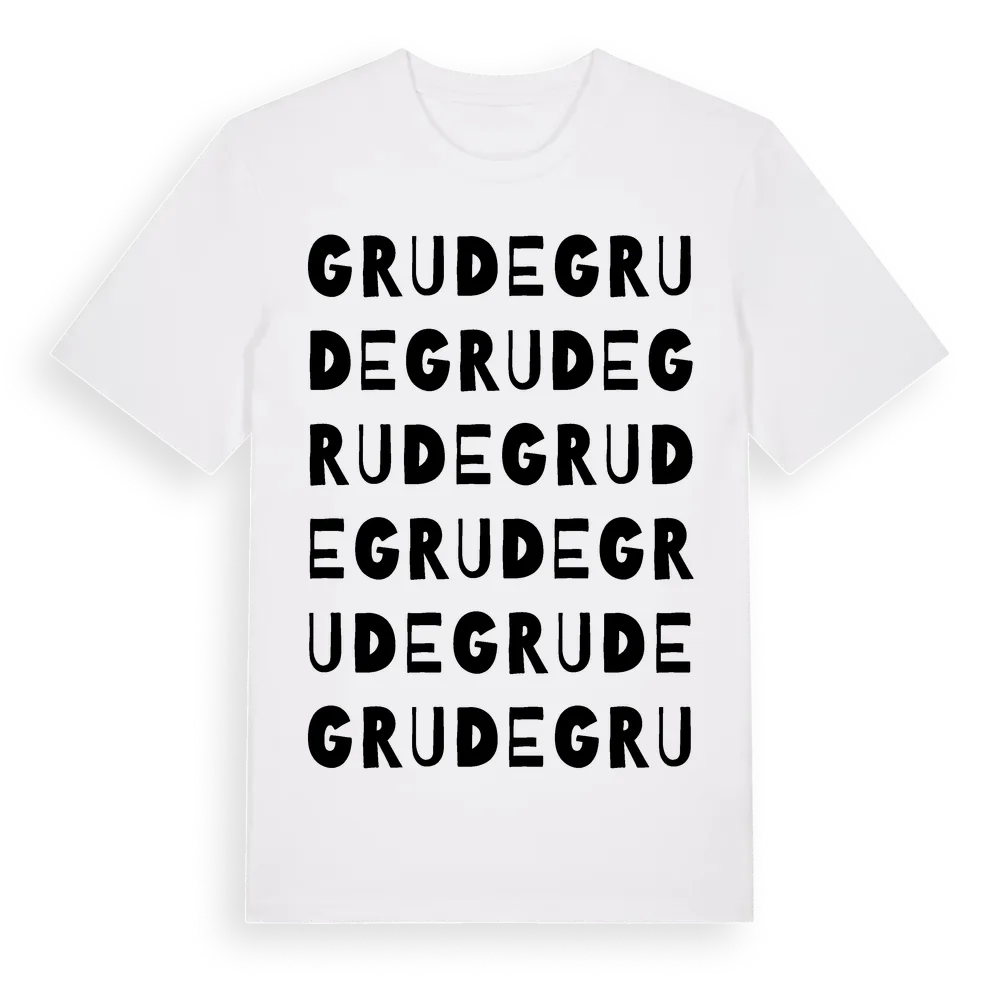 Grude ordlek t-shirt är inspirerad av byn Grude i Västra Götalands län, Sverige. Tröjan är designad för dig som har en speciell koppling till platsen – oavsett om du bor här, har rötterna här eller bara älskar Grude.