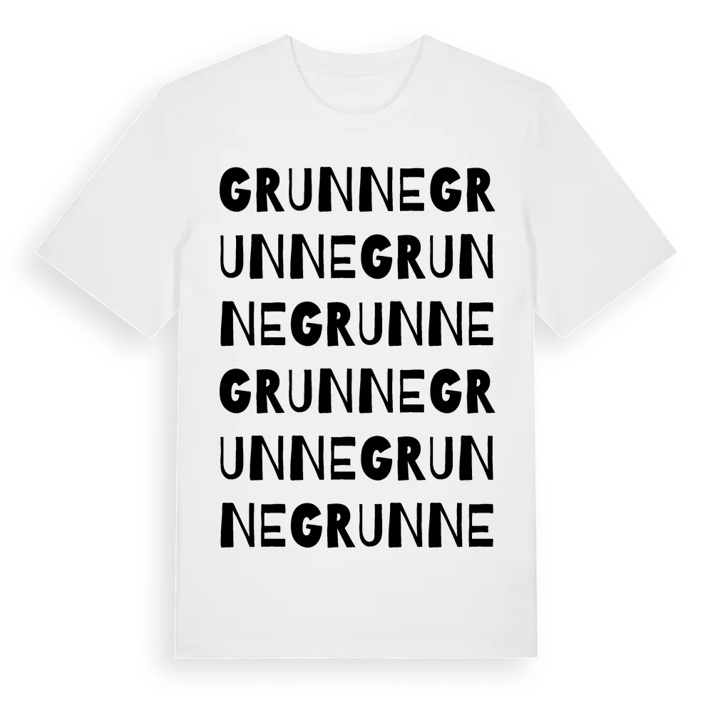 Grunne ordlek t-shirt är inspirerad av byn Grunne i Västra Götalands län, Sverige. Tröjan är designad för dig som har en speciell koppling till platsen – oavsett om du bor här, har rötterna här eller bara älskar Grunne.