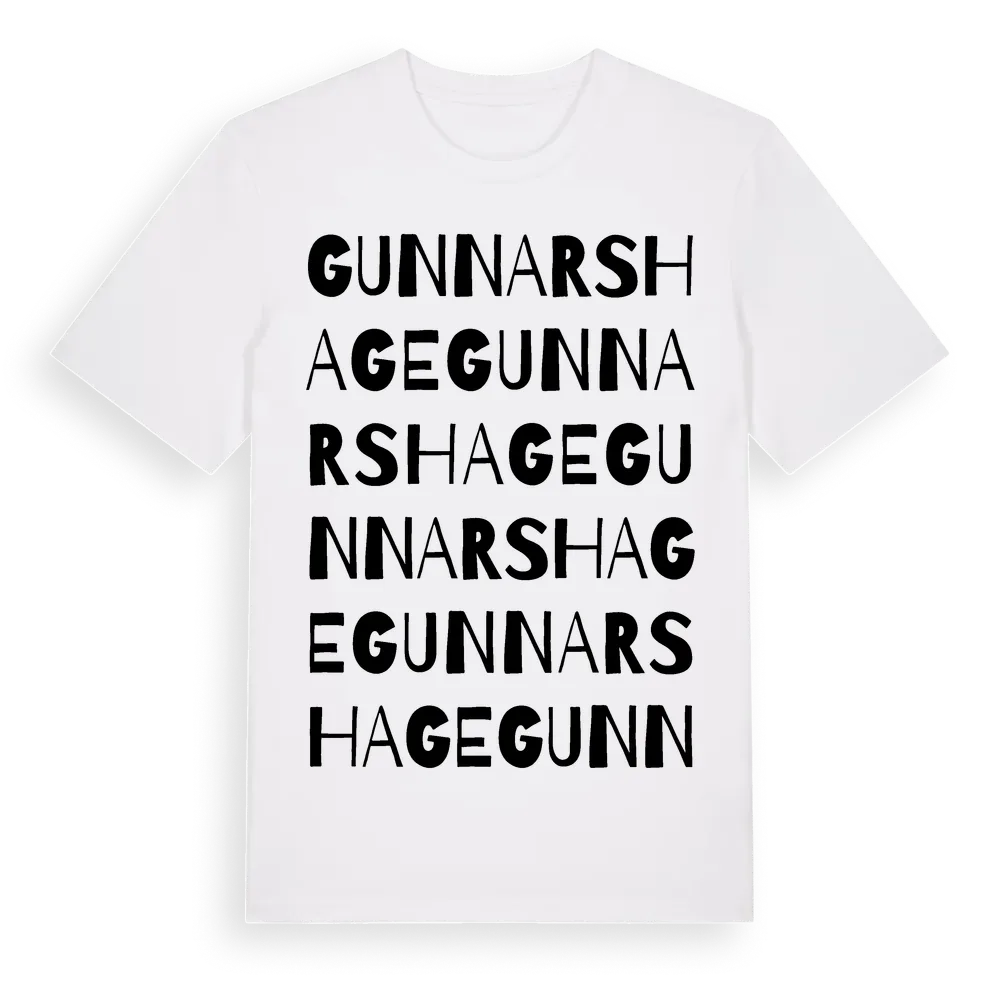 Gunnarshage ordlek t-shirt är inspirerad av Gunnarshage i Västra Götalands län, Sverige. Tröjan är designad för dig som har en speciell koppling till platsen – oavsett om du bor här, har rötterna här eller bara älskar Gunnarshage.
