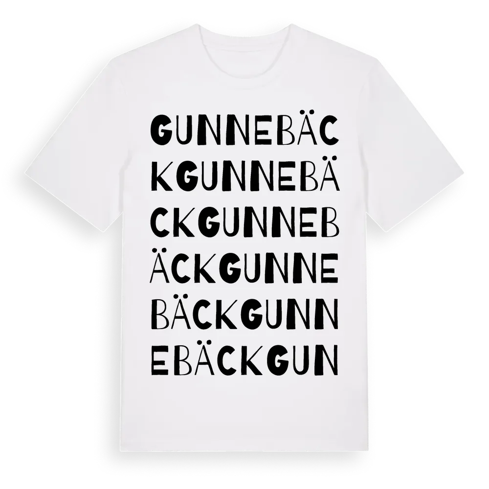 Gunnebäck ordlek t-shirt är inspirerad av byn Gunnebäck i Västra Götalands län, Sverige. Tröjan är designad för dig som har en speciell koppling till platsen – oavsett om du bor här, har rötterna här eller bara älskar Gunnebäck.