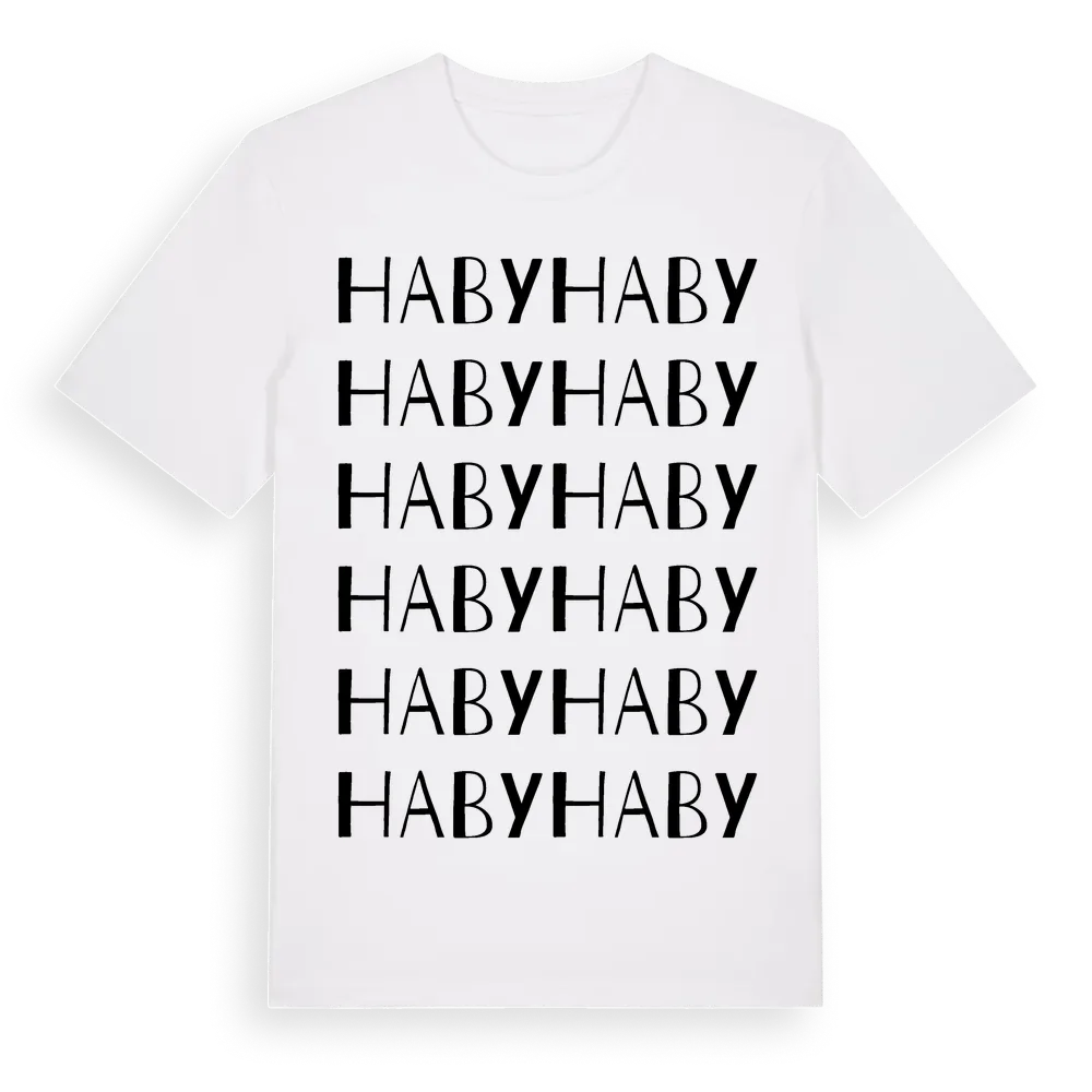Haby ordlek t-shirt är inspirerad av byn Haby i Västra Götalands län, Sverige. Tröjan är designad för dig som har en speciell koppling till platsen – oavsett om du bor här, har rötterna här eller bara älskar Haby.
