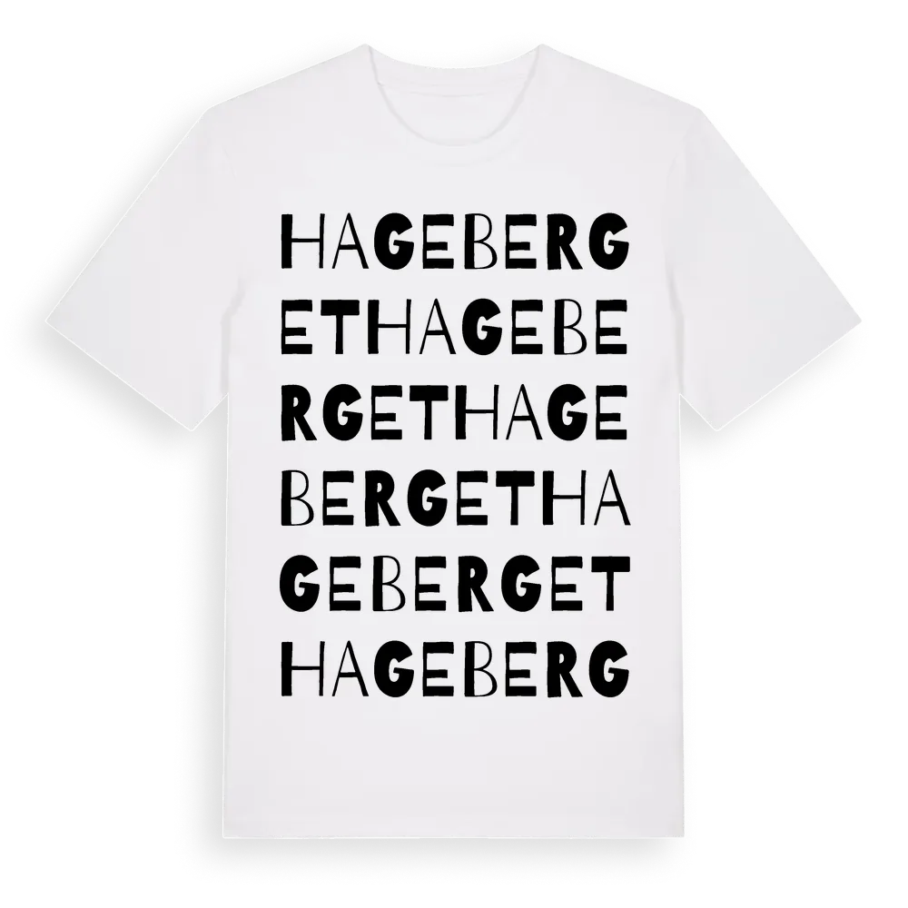 Hageberget ordlek t-shirt är inspirerad av Hageberget i Västra Götalands län, Sverige. Tröjan är designad för dig som har en speciell koppling till platsen – oavsett om du bor här, har rötterna här eller bara älskar Hageberget.