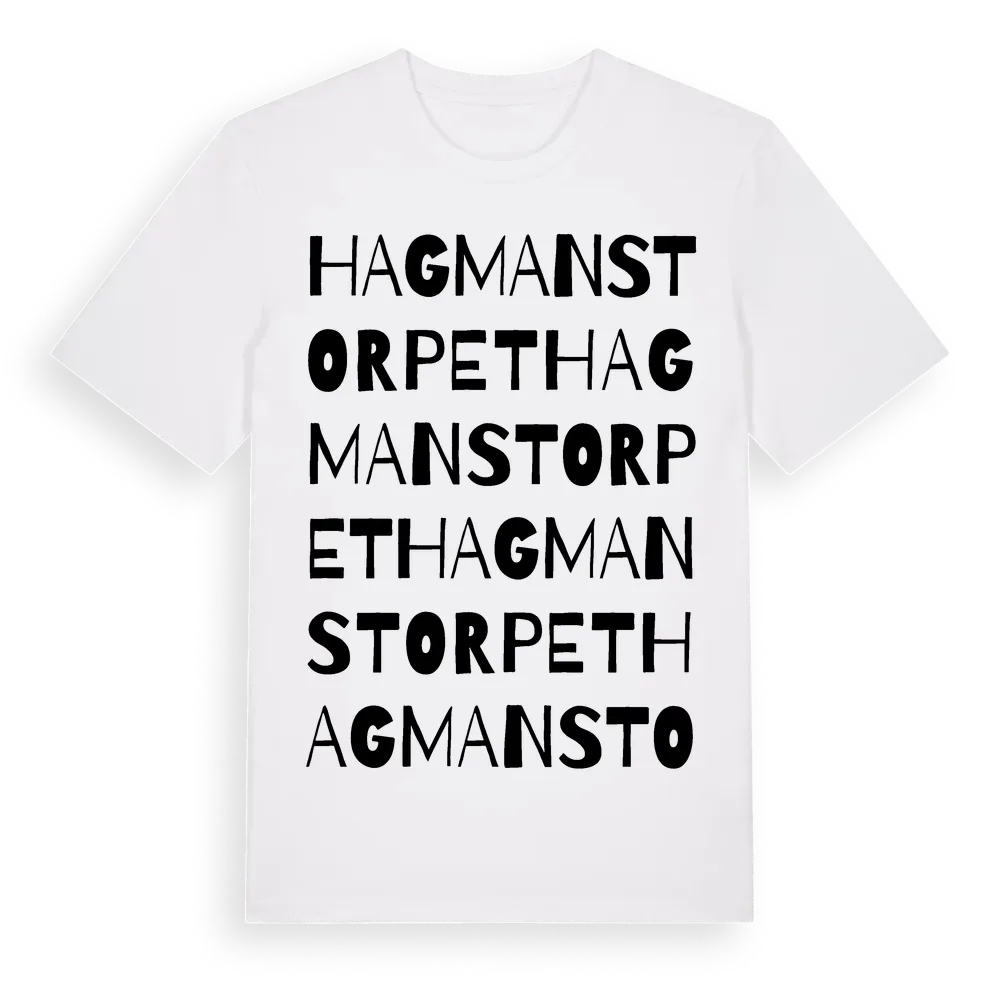 Hagmanstorpet ordlek t-shirt är inspirerad av Hagmanstorpet i Västra Götalands län, Sverige. Tröjan är designad för dig som har en speciell koppling till platsen – oavsett om du bor här, har rötterna här eller bara älskar Hagmanstorpet.