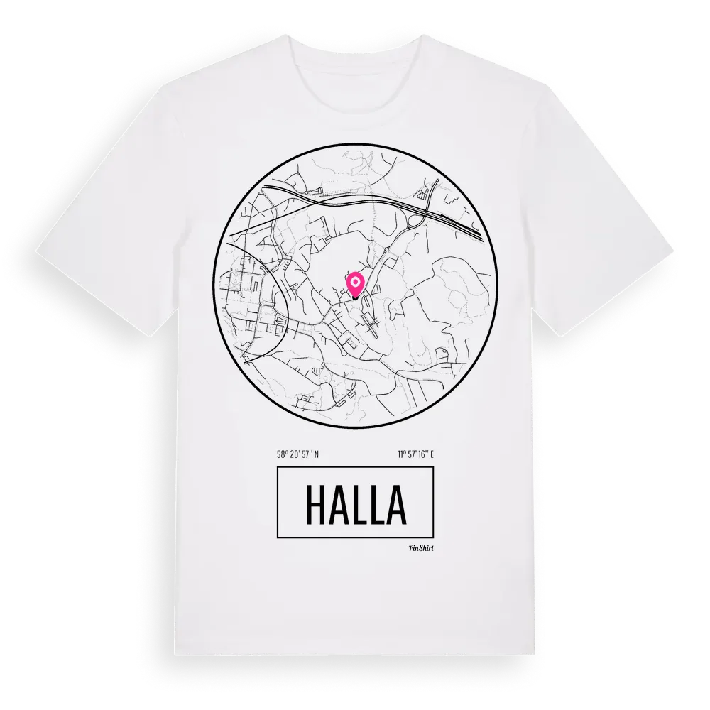 Halla t-shirt är inspirerad av stadsdelen Halla i Västra Götalands län, Sverige. Tröjan är designad för dig som har en speciell koppling till platsen – oavsett om du bor här, har rötterna här eller bara älskar Halla.