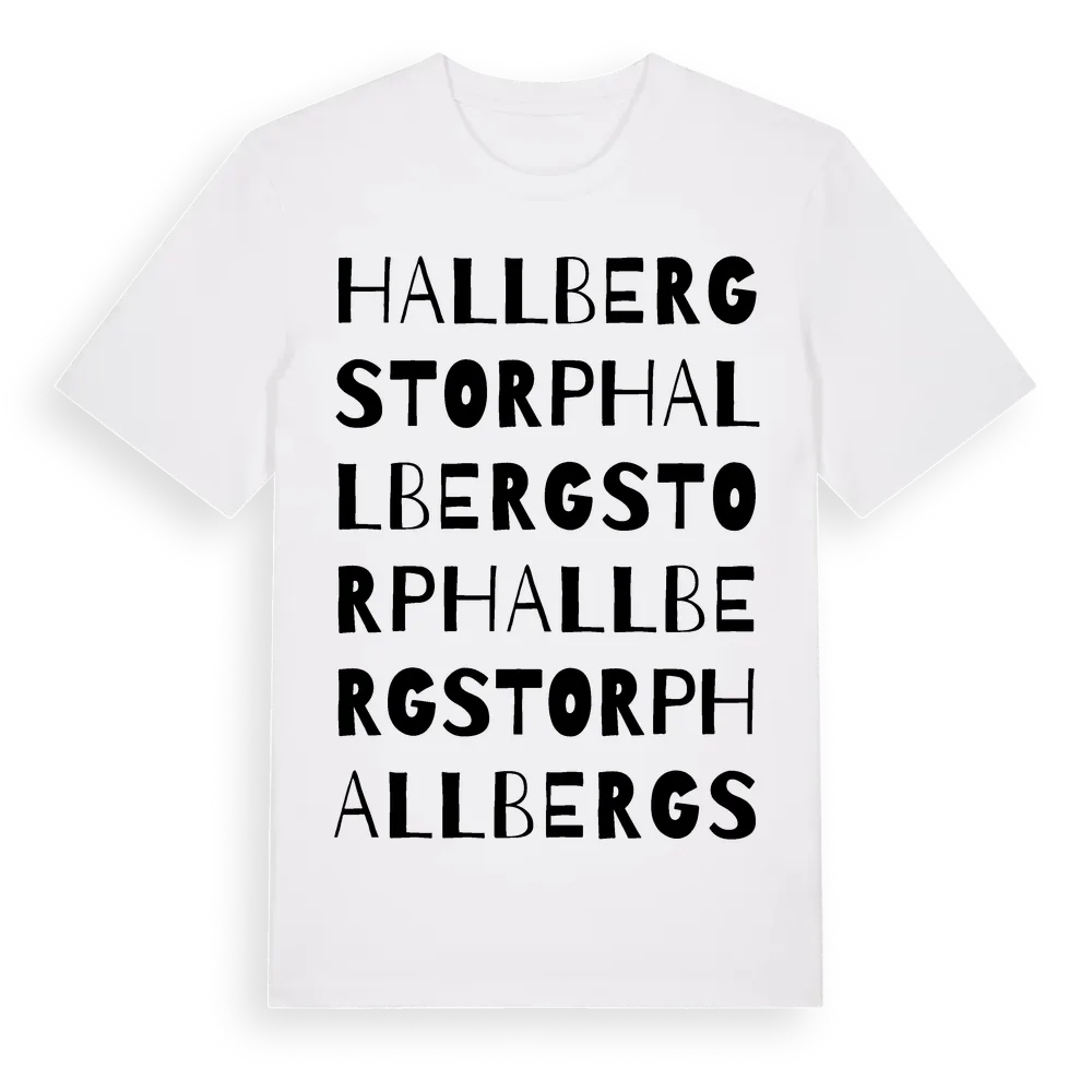 Hallbergstorp ordlek t-shirt är inspirerad av Hallbergstorp i Västra Götalands län, Sverige. Tröjan är designad för dig som har en speciell koppling till platsen – oavsett om du bor här, har rötterna här eller bara älskar Hallbergstorp.