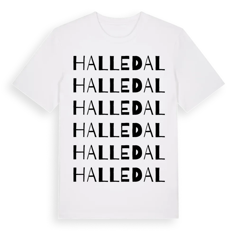 En ordlek byggd på Halledals namn. Subtilt och klurig – ett motiv som bara de som verkligen känner platsen fullt ut förstår. Premium bomull, unisex – från Halledal i Västra Götalands län.