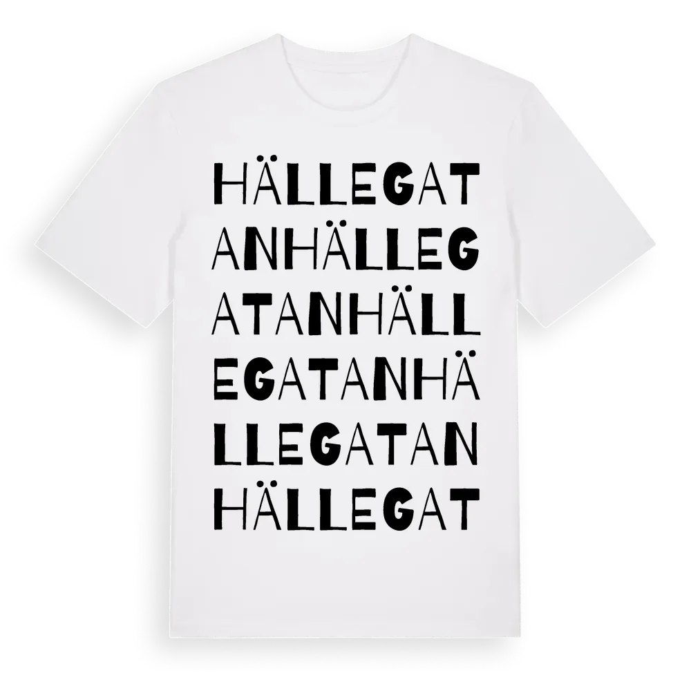 En ordlek byggd på Hällegatans namn. Subtilt och klurig – ett motiv som bara de som verkligen känner platsen fullt ut förstår. Premium bomull, unisex – från Hällegatan i Västra Götalands län.