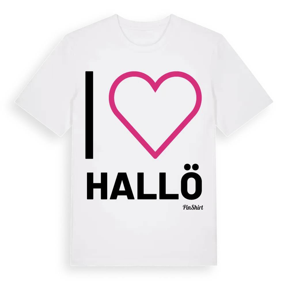 Det klassiska "I ❤ Hallö"-motivet i stort format som täcker hela bröstet. För dig som vill visa kärleken till Hallö på riktigt. Premium bomull, unisex – från Hallö i Västra Götalands län.