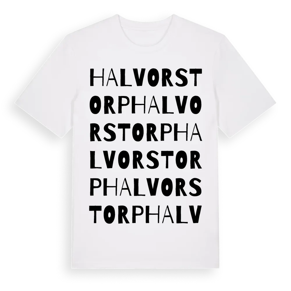 Halvorstorp ordlek t-shirt är inspirerad av stadsdelen Halvorstorp i Västra Götalands län, Sverige. Tröjan är designad för dig som har en speciell koppling till platsen – oavsett om du bor här, har rötterna här eller bara älskar Halvorstorp.