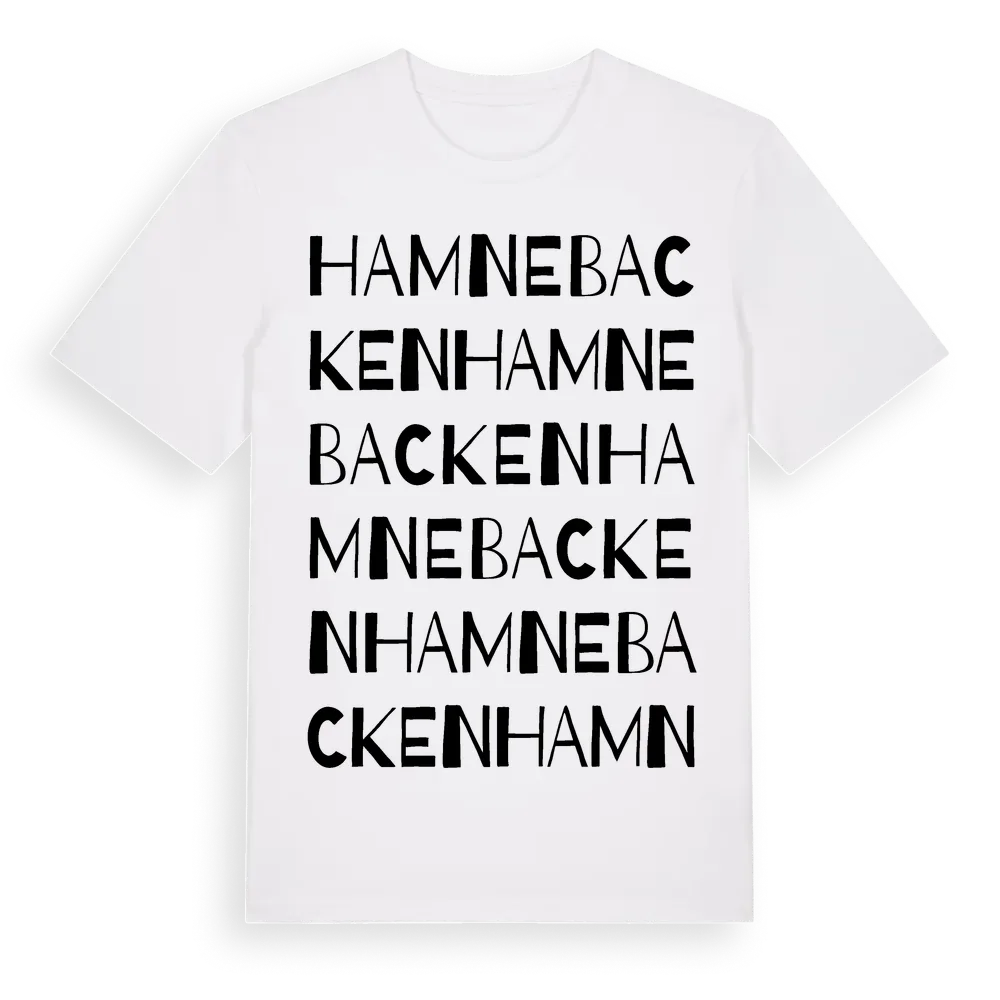 Hamnebacken ordlek t-shirt är inspirerad av Hamnebacken i Västra Götalands län, Sverige. Tröjan är designad för dig som har en speciell koppling till platsen – oavsett om du bor här, har rötterna här eller bara älskar Hamnebacken.