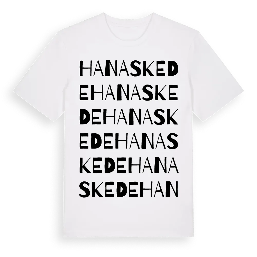 Hanaskede ordlek t-shirt är inspirerad av Hanaskede i Västra Götalands län, Sverige. Tröjan är designad för dig som har en speciell koppling till platsen – oavsett om du bor här, har rötterna här eller bara älskar Hanaskede.