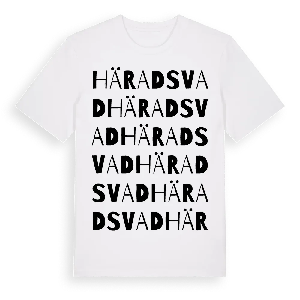 Häradsvad ordlek t-shirt är inspirerad av byn Häradsvad i Västra Götalands län, Sverige. Tröjan är designad för dig som har en speciell koppling till platsen – oavsett om du bor här, har rötterna här eller bara älskar Häradsvad.