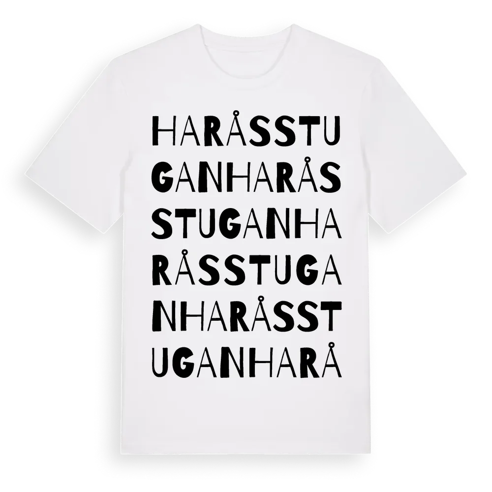 Haråsstugan ordlek t-shirt är inspirerad av Haråsstugan i Västra Götalands län, Sverige. Tröjan är designad för dig som har en speciell koppling till platsen – oavsett om du bor här, har rötterna här eller bara älskar Haråsstugan.