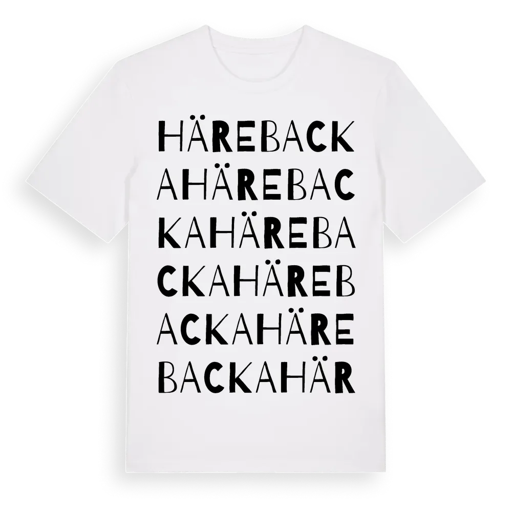 Härebacka ordlek t-shirt är inspirerad av byn Härebacka i Västra Götalands län, Sverige. Tröjan är designad för dig som har en speciell koppling till platsen – oavsett om du bor här, har rötterna här eller bara älskar Härebacka.