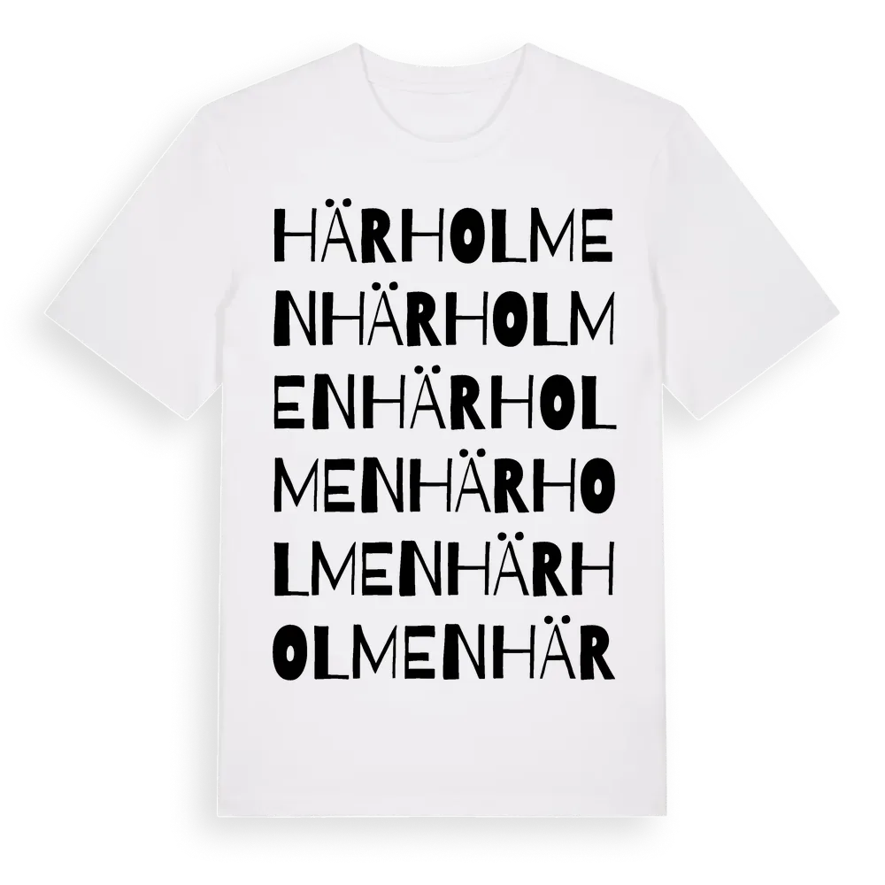 Härholmen ordlek t-shirt är inspirerad av Härholmen i Västra Götalands län, Sverige. Tröjan är designad för dig som har en speciell koppling till platsen – oavsett om du bor här, har rötterna här eller bara älskar Härholmen.