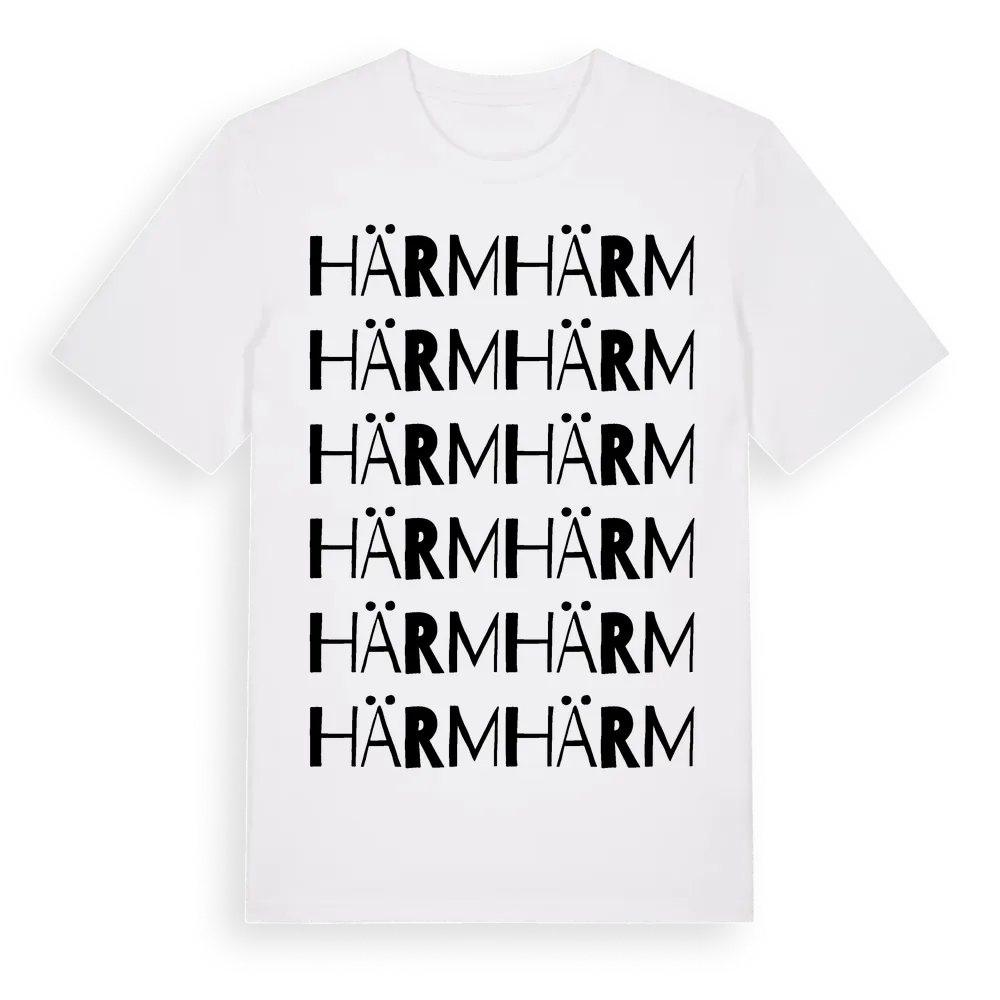 En ordlek byggd på Härms namn. Subtilt och klurig – ett motiv som bara de som verkligen känner platsen fullt ut förstår. Premium bomull, unisex – från Härm i Västra Götalands län.