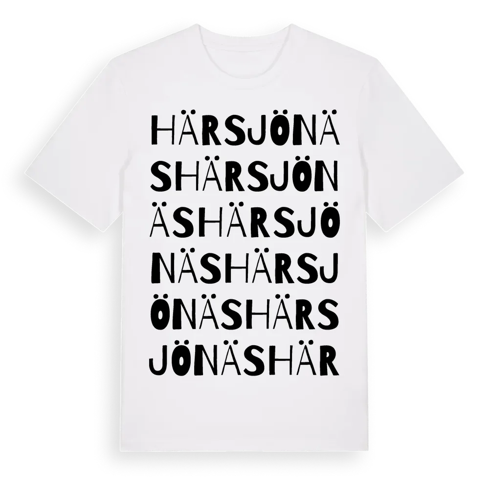 Härsjönäs ordlek t-shirt är inspirerad av Härsjönäs i Västra Götalands län, Sverige. Tröjan är designad för dig som har en speciell koppling till platsen – oavsett om du bor här, har rötterna här eller bara älskar Härsjönäs.