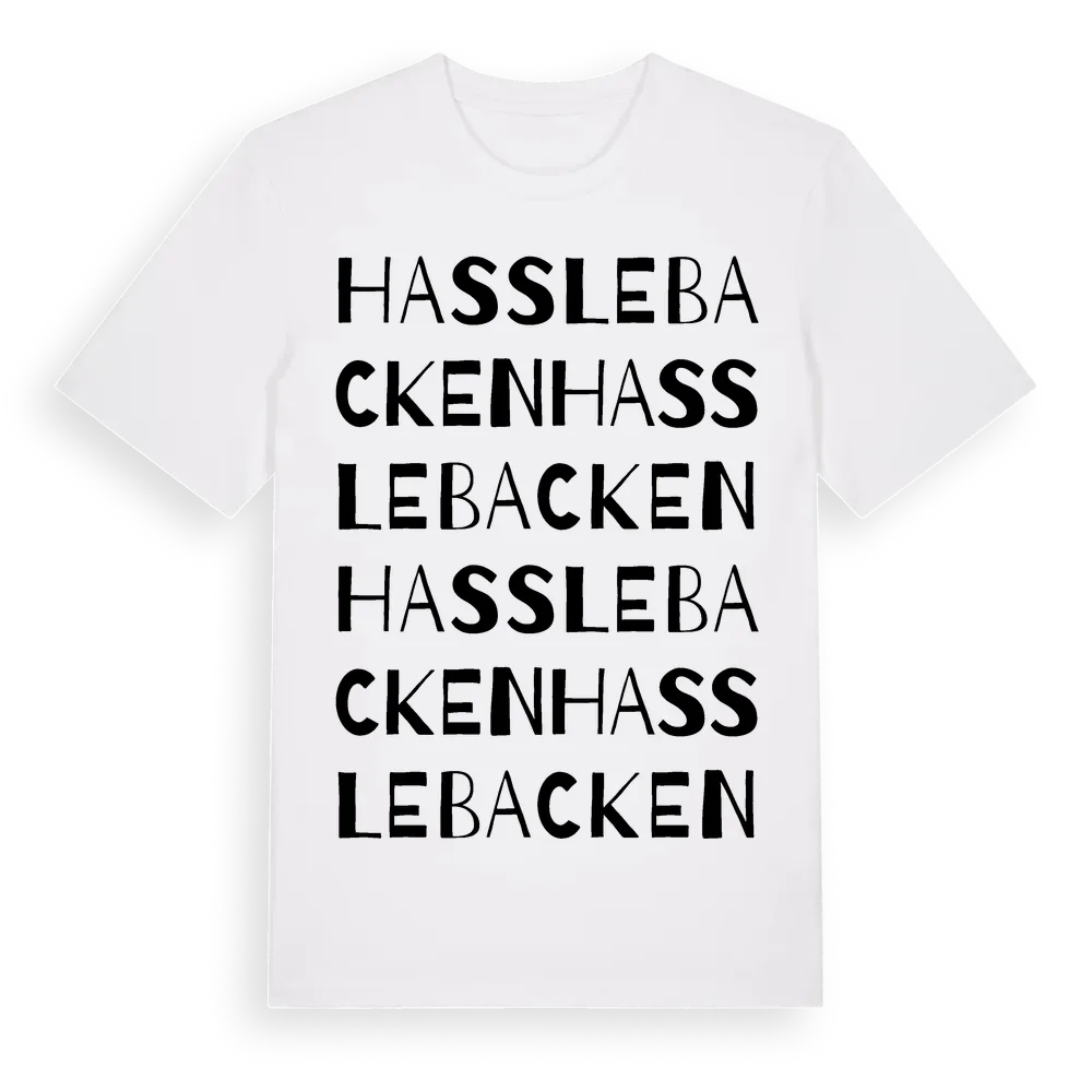 Hasslebacken ordlek t-shirt är inspirerad av Hasslebacken i Västra Götalands län, Sverige. Tröjan är designad för dig som har en speciell koppling till platsen – oavsett om du bor här, har rötterna här eller bara älskar Hasslebacken.