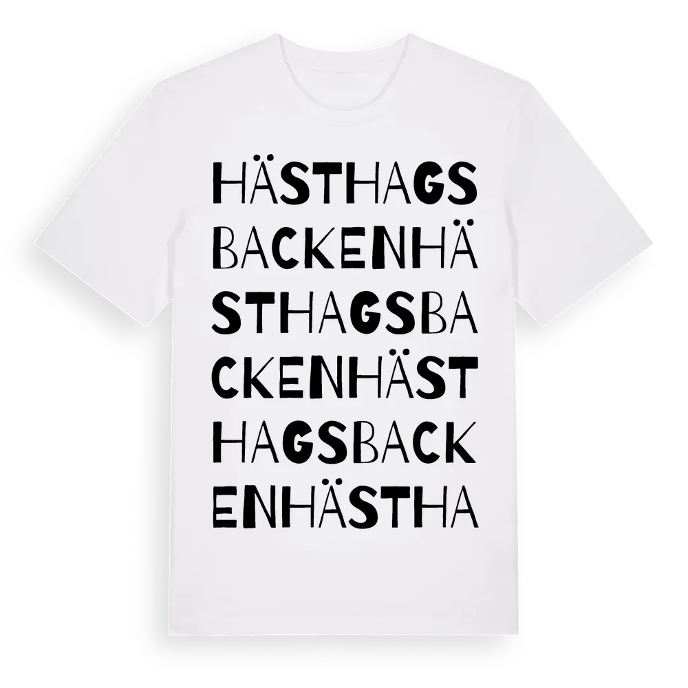 Hästhagsbacken ordlek t-shirt är inspirerad av Hästhagsbacken i Västra Götalands län, Sverige. Tröjan är designad för dig som har en speciell koppling till platsen – oavsett om du bor här, har rötterna här eller bara älskar Hästhagsbacken.
