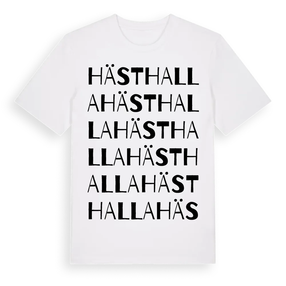 Hästhalla ordlek t-shirt är inspirerad av byn Hästhalla i Västra Götalands län, Sverige. Tröjan är designad för dig som har en speciell koppling till platsen – oavsett om du bor här, har rötterna här eller bara älskar Hästhalla.
