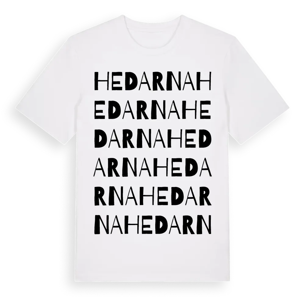 Hedarna ordlek t-shirt är inspirerad av Hedarna i Västra Götalands län, Sverige. Tröjan är designad för dig som har en speciell koppling till platsen – oavsett om du bor här, har rötterna här eller bara älskar Hedarna.
