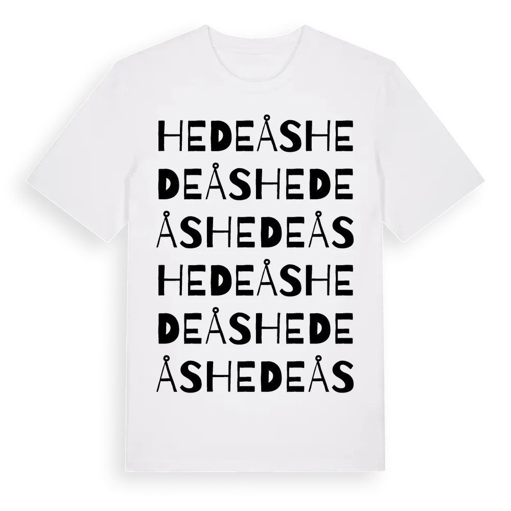 Hedeås ordlek t-shirt är inspirerad av Hedeås i Västra Götalands län, Sverige. Tröjan är designad för dig som har en speciell koppling till platsen – oavsett om du bor här, har rötterna här eller bara älskar Hedeås.