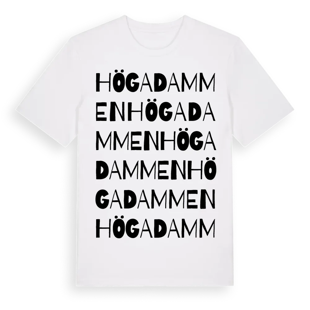 Högadammen ordlek t-shirt är inspirerad av Högadammen i Västra Götalands län, Sverige. Tröjan är designad för dig som har en speciell koppling till platsen – oavsett om du bor här, har rötterna här eller bara älskar Högadammen.