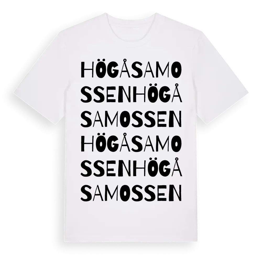Högåsamossen ordlek t-shirt är inspirerad av Högåsamossen i Västra Götalands län, Sverige. Tröjan är designad för dig som har en speciell koppling till platsen – oavsett om du bor här, har rötterna här eller bara älskar Högåsamossen.