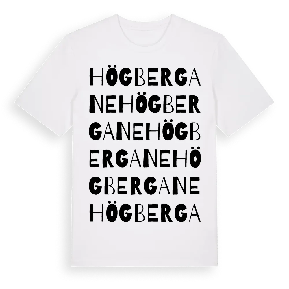 Högbergane ordlek t-shirt är inspirerad av Högbergane i Västra Götalands län, Sverige. Tröjan är designad för dig som har en speciell koppling till platsen – oavsett om du bor här, har rötterna här eller bara älskar Högbergane.