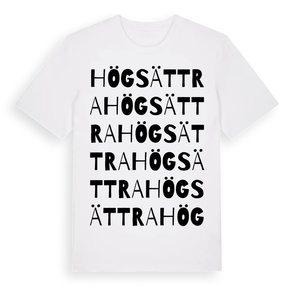 Högsättra ordlek t-shirt är inspirerad av byn Högsättra i Västra Götalands län, Sverige. Tröjan är designad för dig som har en speciell koppling till platsen – oavsett om du bor här, har rötterna här eller bara älskar Högsättra.