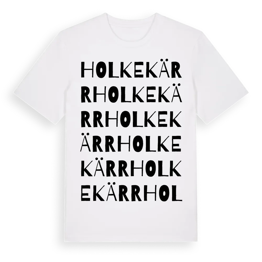 Holkekärr ordlek t-shirt är inspirerad av byn Holkekärr i Västra Götalands län, Sverige. Tröjan är designad för dig som har en speciell koppling till platsen – oavsett om du bor här, har rötterna här eller bara älskar Holkekärr.