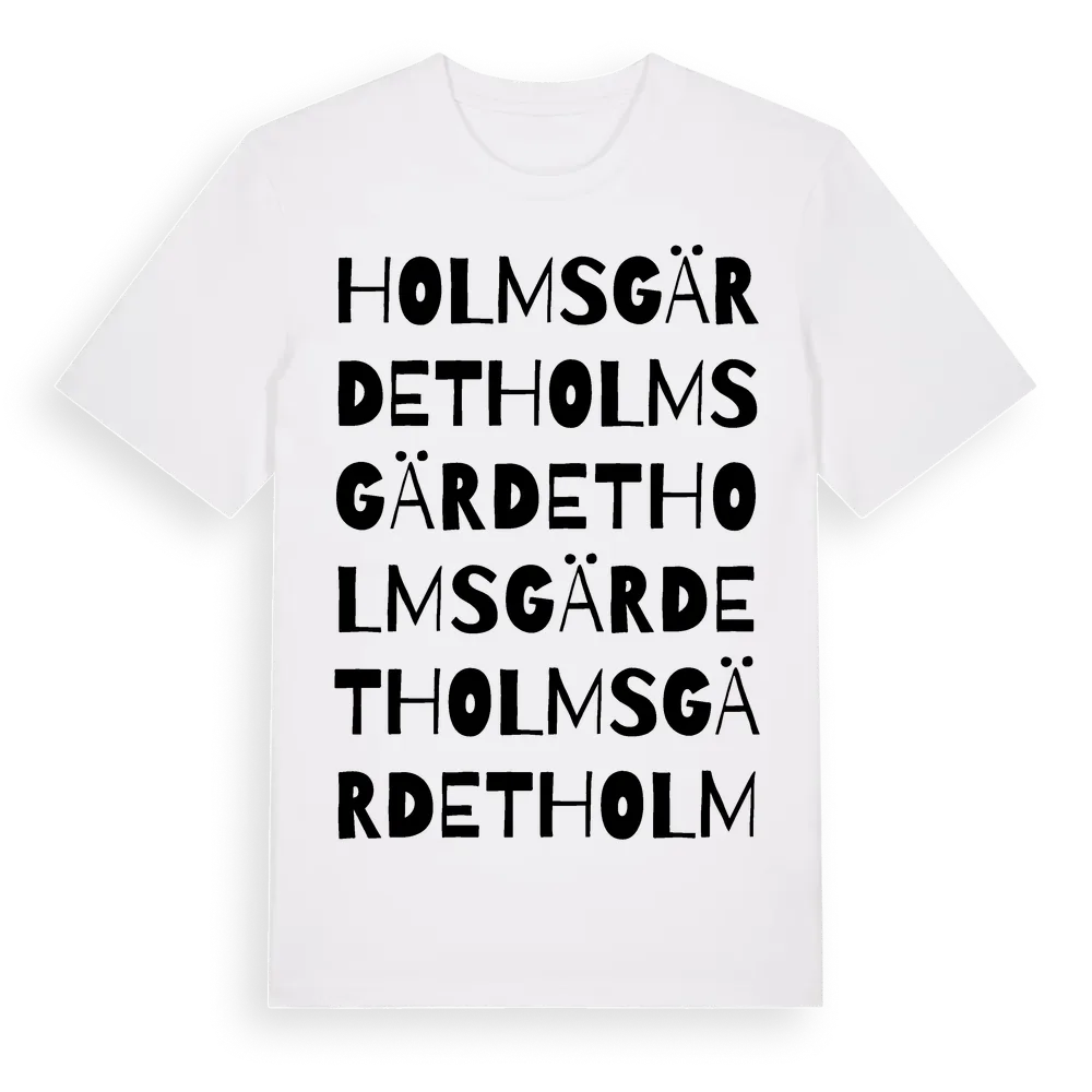 Holmsgärdet ordlek t-shirt är inspirerad av Holmsgärdet i Västra Götalands län, Sverige. Tröjan är designad för dig som har en speciell koppling till platsen – oavsett om du bor här, har rötterna här eller bara älskar Holmsgärdet.