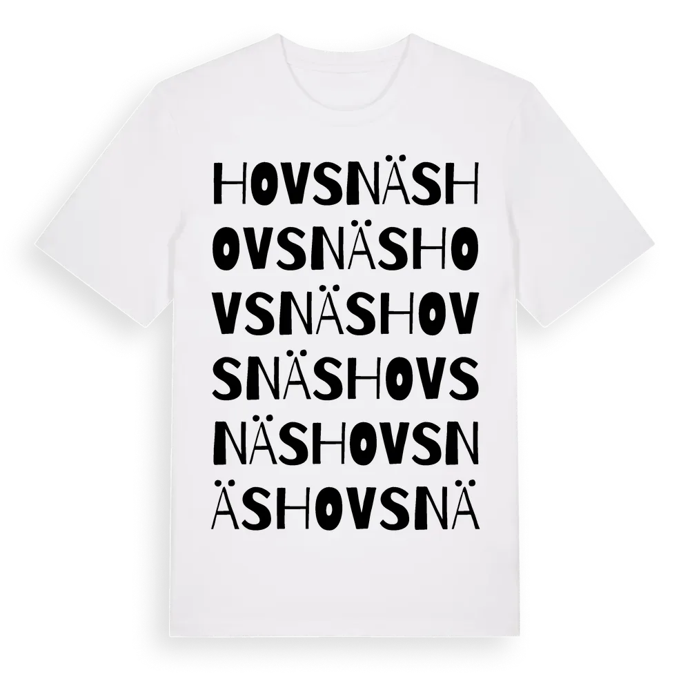 En ordlek byggd på Hovsnäss namn. Subtilt och klurig – ett motiv som bara de som verkligen känner platsen fullt ut förstår. Premium bomull, unisex – från Hovsnäs i Västra Götalands län.